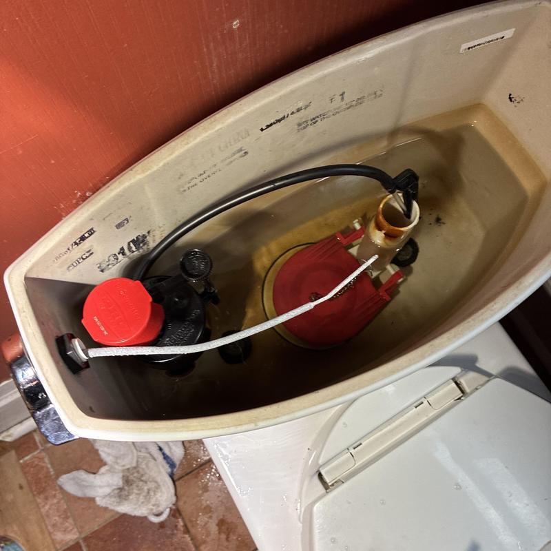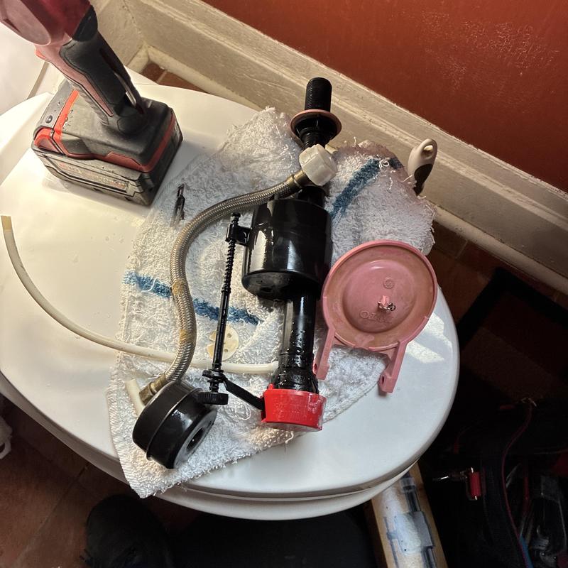 A licensed plumber in San Francisco, California repaired a leaking toilet by replacing the fill valve, flapper, and water supply line. The service included water level adjustment and flush testing. The technician also inspected the toilet seat and advised a follow-up visit due to missing specialty screws needed for replacement.