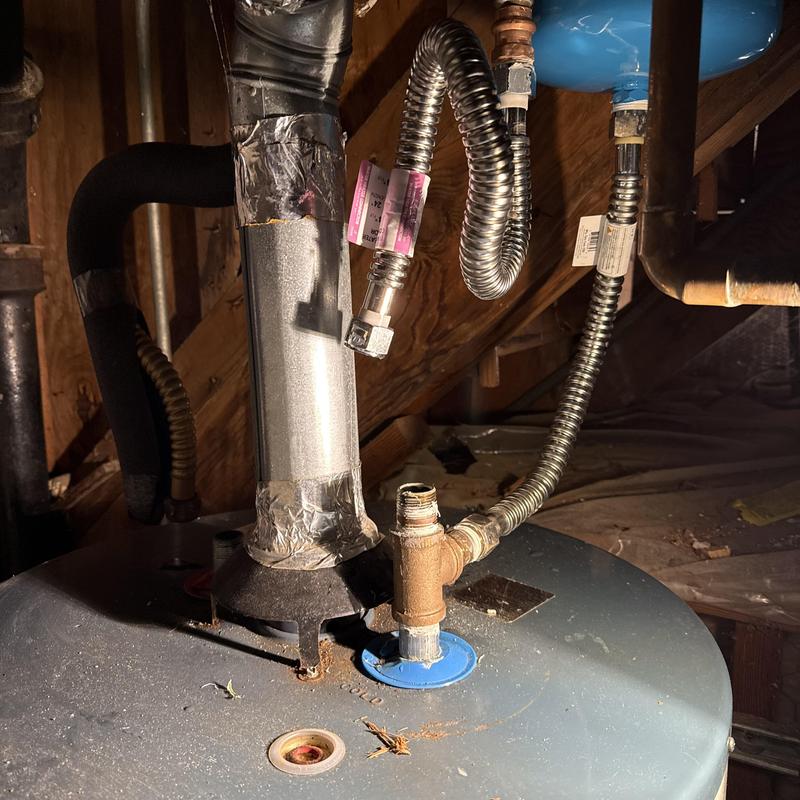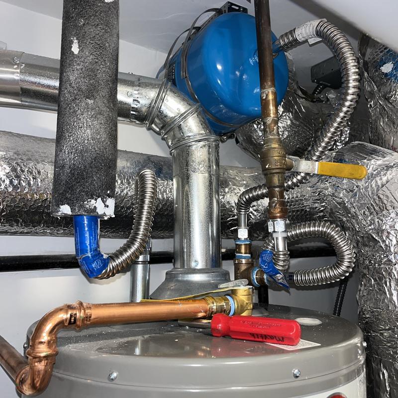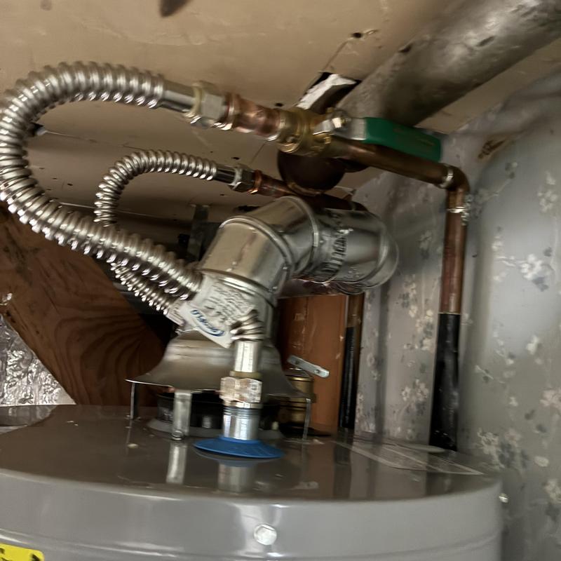 Heises Plumbing replaced a water heater in Menlo Park, California. The technician installed a 40-gallon shorty model, added seismic straps, soldered a 1 MIP fitting, replaced the gas flex line, secured the flue pipe with self-tapping screws, and tested all systems for function, gas safety, and venting integrity.