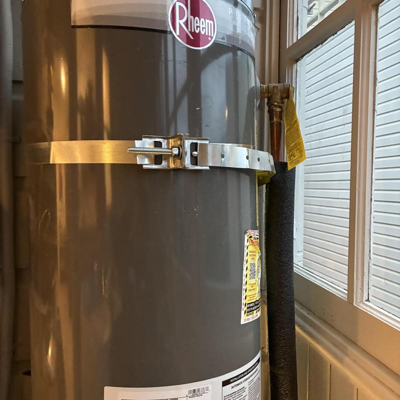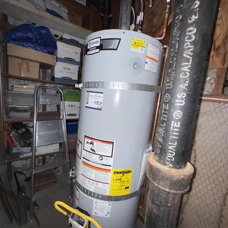 Heises Plumbing replaced a 40-gallon water heater at a home in San Francisco, California. Technicians installed new copper piping and water supply lines. They reused the existing gas flex and seismic straps. After completing the installation, they lit the pilot light, started the unit, and tested the system to confirm proper operation.