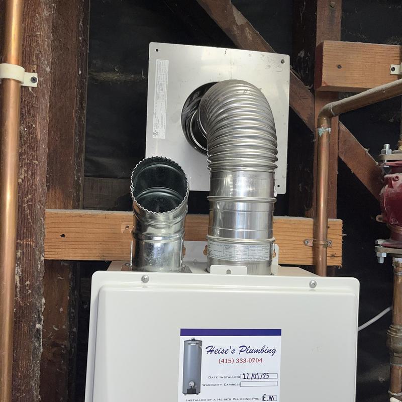 Heise's Plumbing installed a 50-gallon gas water heater in San Francisco, California. The team secured the unit with earthquake strapping, replaced the gas and water supply lines, installed a new gas control valve, repaired the venting, and tested the system to ensure safe and proper operation.
