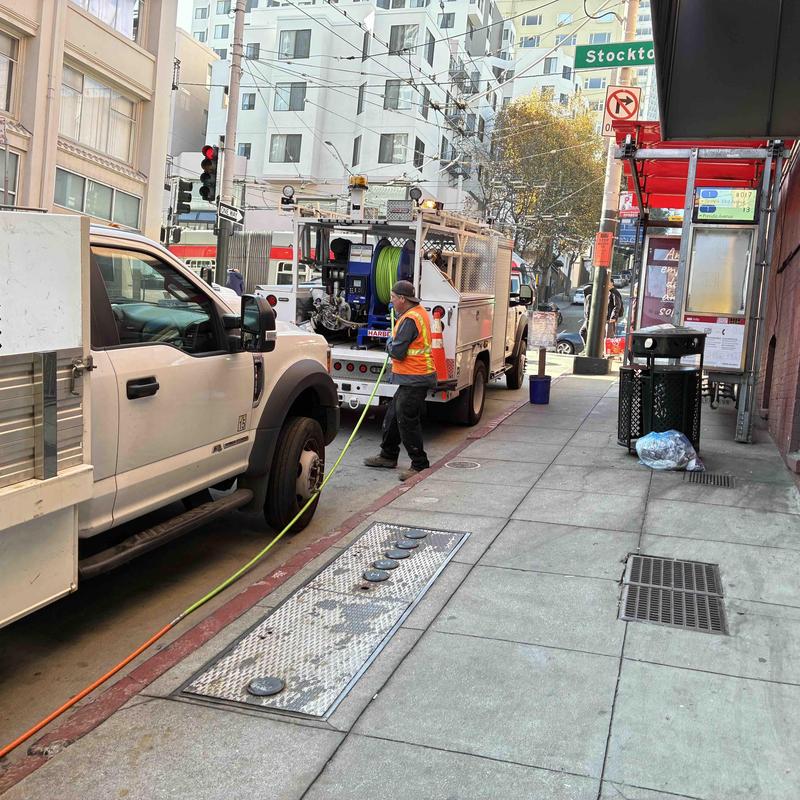 Technicians provided emergency sewer line cleaning for a restaurant in San Francisco, California. They used a Harben high-pressure jetter to remove grease buildup, flush the line, and restore proper flow. Crews verified water flow at all fixtures and cleaned the area to allow normal kitchen operations to resume.