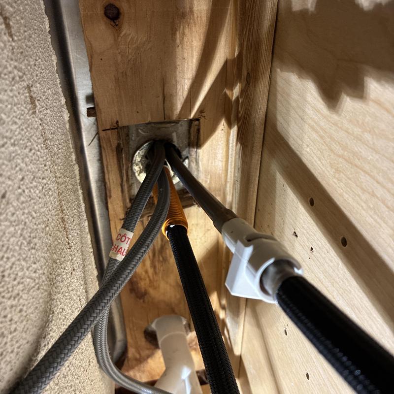 Heises Plumbing repaired a kitchen sink in Portola Valley, California. The technician replaced hot and cold angle stops, added new chrome escutcheons, and soldered a new copper stub-out to fix a leak. All plumbing connections were pressure-tested to ensure proper function in the single-family home’s kitchen.