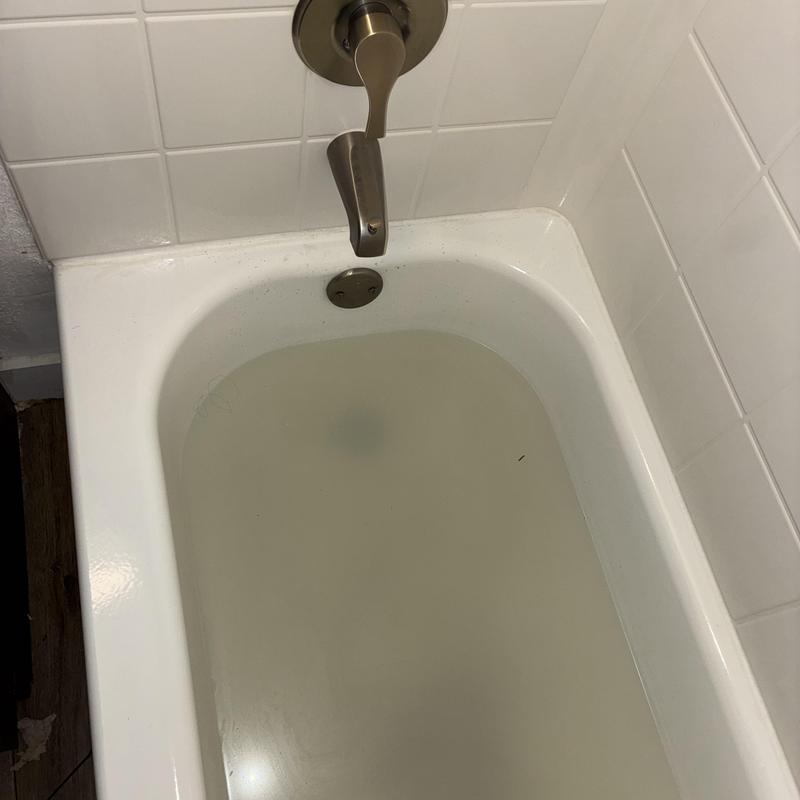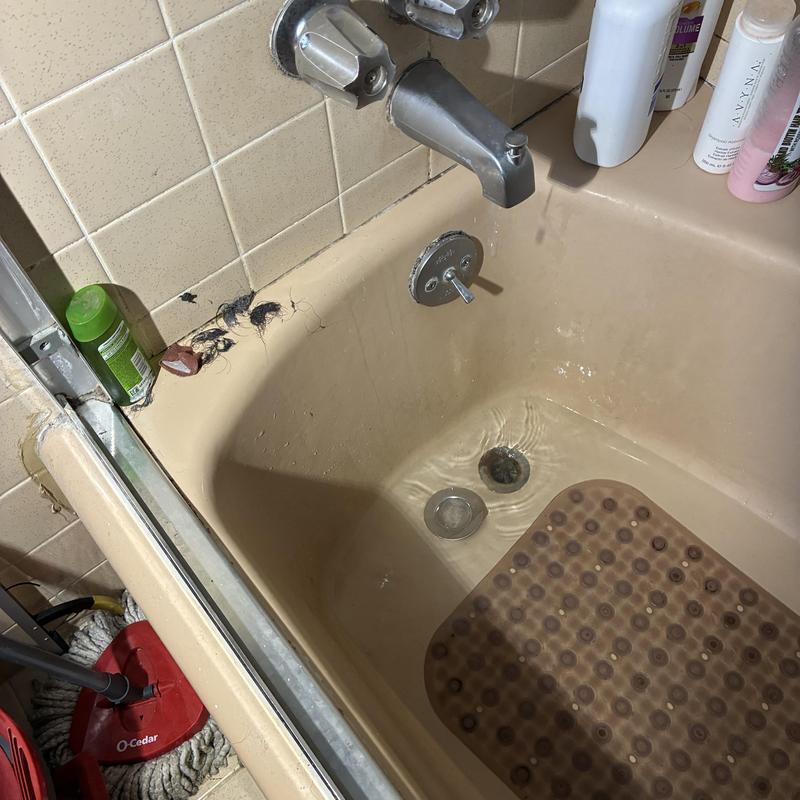 A plumber cleared a clogged bathtub and shower drain during an emergency service on a Sunday in San Francisco, California. The clogged drain was on the second floor. The plumber restored drainage and verified that water flowed properly through both fixtures before completing the service.