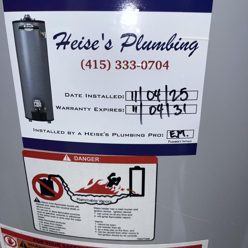 HEISE'S PLUMBING installed a 50-gallon water heater in San Francisco, California. The work included removing the old unit, connecting new water and gas lines, installing proper venting and an expansion tank, securing the tank with earthquake straps, and testing all components to meet California safety standards. The team completed full setup and thorough cleanup.