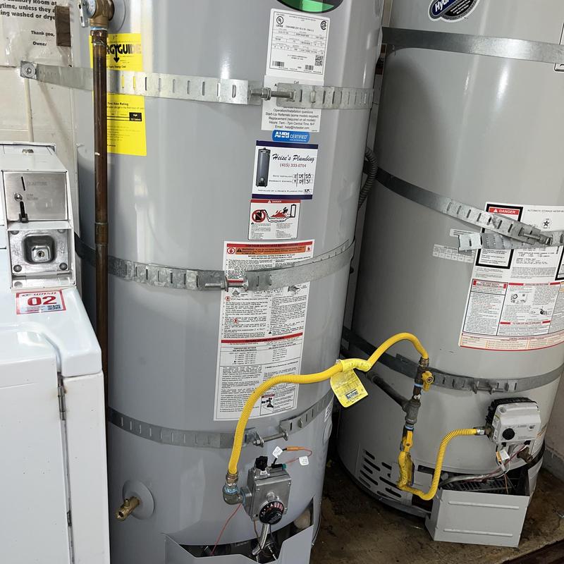 Heise's Plumbing replaced a 40-gallon water heater in San Francisco, CA. The team removed the old unit, installed a new gas shut-off valve, added supply hoses and MIP fittings, and secured the new heater with a seismic strap kit. The installation included testing and was completed in about two hours.